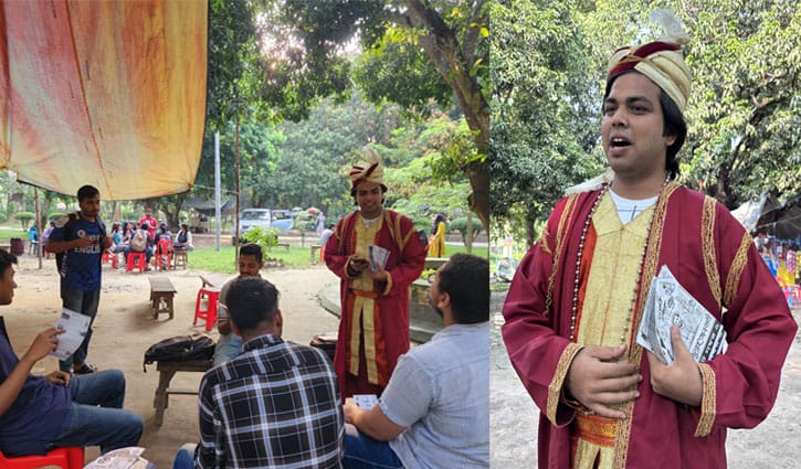 অভিনব সাজে নির্বাচনী রাকসুতে প্রচারণায় এক প্রার্থী