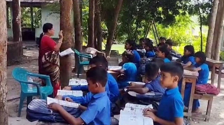 খোলা আকশের নিচে ক্লাস করছে কোমলমতি শিক্ষার্থীরা