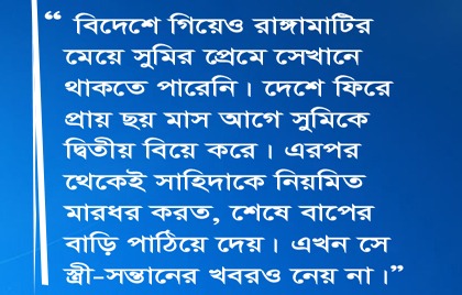 এদিকে যাওয়ার পূর্বে মাছ ধরতে মিজান রাঙ্গামাটির কাপ্তাই লেকে যায় সেখানে সেখানে সুমি নামে একটি মেয়ের সাথে তার সম্পর্ক গড়ে ওঠে। মাছ ধরা শেষ হলে সে রাঙ্গামাটি থেকে চলে আসলেও মোবাইলে তাদের যোগাযোগ ঠিক চলতো আর এর জন্যই শ্বশুড় বাড়ীর টাকায় বিদেশ গিয়েও সে থাকতে পারেনি দেশে চলে আসতে হয়েছে। দেশে ফিরে আসের পর সুমির সাথে সম্পর্ক গভীর করতে গিয়ে মিজানের গলার কাঁটা হয়ে দাঁড়ায় সাহিদা। তাই বিভিন্ন অজুহাতে তার উপর চালাত নির্যাতনের স্টিমরোলার যাতে সহ্য না করে চিরতরে চলে যায়। আর এই নির্যাতন শরিক মিজানের বাবা সাগর মিয়া ও তার বাবার দ্বিতীয় স্ত্রী ফাতেমা বেগম। তারা কখনোই ছেলেকে ডাক দোহাই দিতো না বরং ছেলেকে উস্কে দিতো।