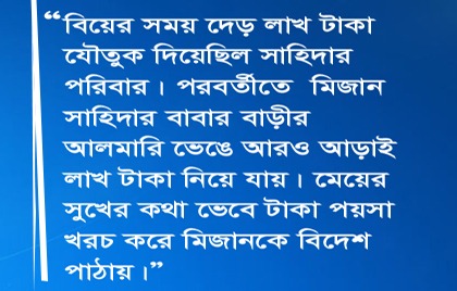 বিয়েতে যৌতুক হিসেবে দেওয়া হয় নগদ দেড় লাখ টাকা স্বর্ণালঙ্কার তাছাড়া মেয়ে থাকার জন্য একটি ঘর পর্যন্ত তুলে দেন। এখানেই ক্ষান্ত হয়নি মিজান ও তার পরিবার। বিয়ের পর খয়েকদিন পর থেকে মিজান তার স্ত্রী সাহিদাকে বাবার বাড়ী থেকে টাকা-পয়সা এনে দেওয়ার জন্য চাপ প্রয়োগ করতে এবং সেই সাথে মারধর। একসময় মেয়ের সুখের কথা চিন্তা করে সাহিদার মা-বাবা মিজানকে দুবাই পাঠায়। কিন্তু সেখানে বেশীদিন থাকতে পারেনি। অল্প কিছু দিনের মধ্যেই সে দেশে ফিরে আসে।