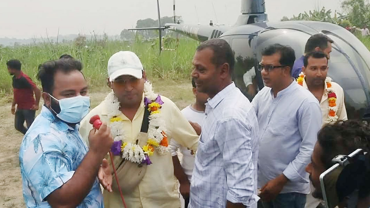এদিন ঢাকার হযরত শাহজালাল আন্তর্জাতিক বিমানবন্দর থেকে হেলিকপ্টারে চড়ে যাত্রা করে বেলাব উপজেলার দড়িকান্দি গ্রামে নিজ বাড়িতে পৌঁছান মালয়েশিয়া প্রবাসী মো. হানিফ ও তার ভাই মানিক।